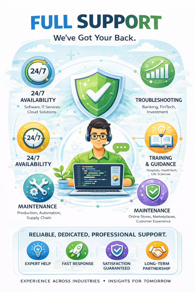 At Aliftetah Information Technology Co LLC, we provide end-to-end support to ensure your systems run smoothly at all times. From initial setup and deployment to ongoing maintenance and troubleshooting, our dedicated team is always ready to assist you.
